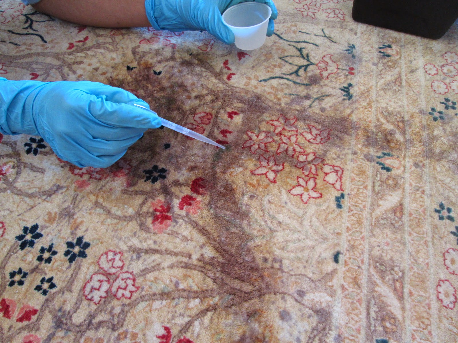Some clients think stain removal is a do-it-yourself job and take their chances to take care of the stains when it happens. Each stain is different in nature. Some stains and their contents are man-made such as kool aid, and Coca Cola/Pepsi. Other stains like blood, and pet urine are organic. There is a third category and that is petrochemicals like glue, grease, etc. Each of these categories need a different type of solution to be removed. There are others players here that we have to take into consideration when it comes to stain removal. Construction of the rug (cotton, wool, silk, jute, etc.), and the type of dye used in the rug are also important. Dosage and how strong the solution is could make a big difference in stain removal. If a client bleaches the rug by using unknown or strong chemicals, then it would be way more difficult to deal with the stain.