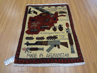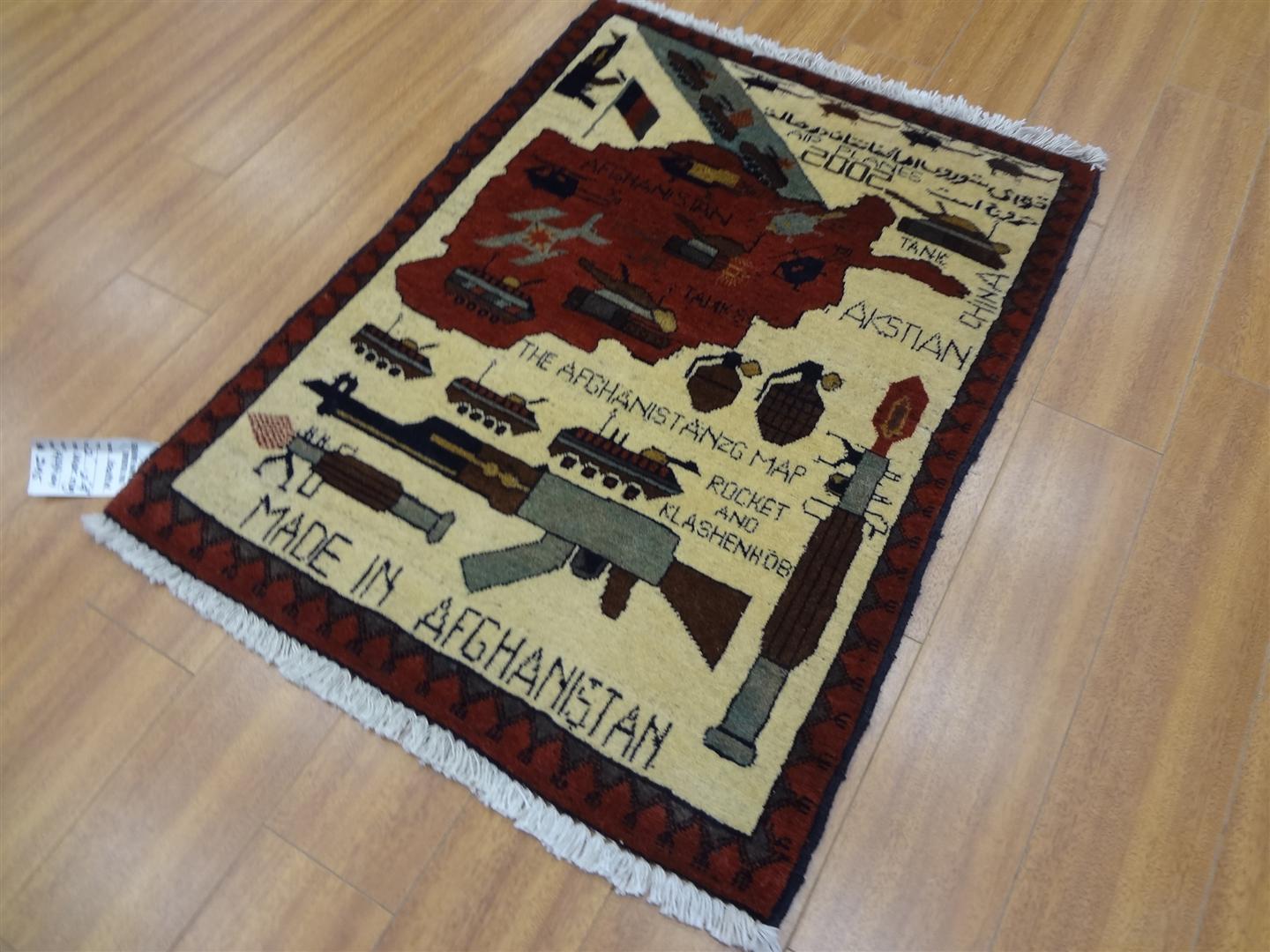 Today we are showing you a great handmade Afghan rug in our inventory that fits in the category of ‘war rugs’. The war rug tradition of Afghanistan has its origins in the decade of Soviet occupation of Afghanistan from 1979, and has continued through subsequent military, political and social conflicts. Afghan rug-makers began incorporating the apparatus of war into their designs almost immediately after the Soviet Union invaded their country. They continue to do so today in the wake of the United States’ 2001 invasion of Afghanistan which ousted the Taliban government of Mullah Omar but has failed to bring an end to violence in the country. The rugs produced in response to these events are among the world’s richest traditions of war art of the late 20th and early 21st centuries.