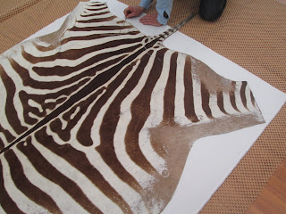 On some of these hides and skins, we have installed fabric/canvas baking to keep them flat on the floors. The owner of two of these zebrahides wanted to have brown canvas straps installed on the edges of the hides that we did.