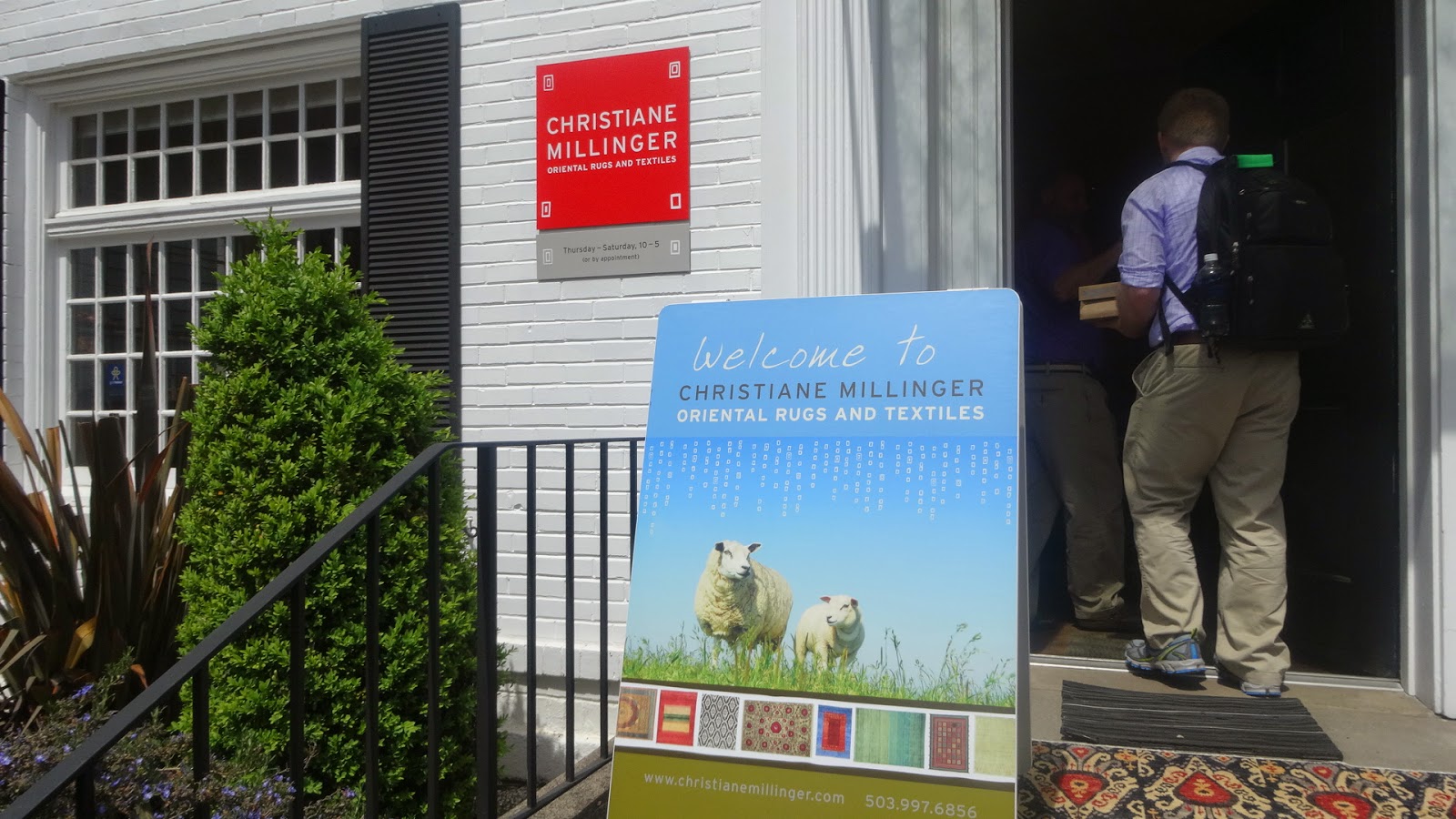 After this, four visits to four rug galleries were planned and we visited all these four stores on foot as they were in the Portland down town area. They were Christianne Millinger’s gallery, where we had lunch, Lapci, Tufenkian, and Santos. A game of treasure hunting was also planned for the group and we were given one picture of a rug to be found in each rug store. The winner, Meg Walker received a small Indian Gabbeh from Leslie and Tom Atiyeh’s Happy Camel’s collection.