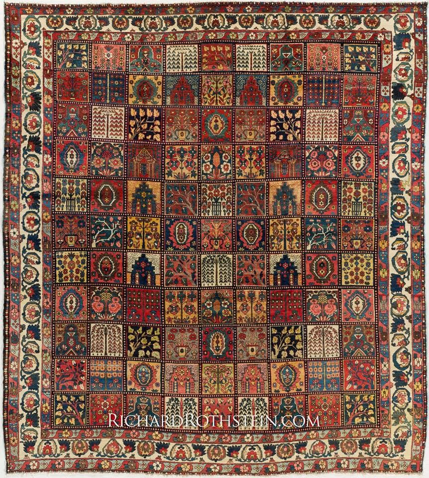 The craftsmen of the Bakhtiari rug come from the Bakhtiari Tribe, located in the Chahar Mahal region of Iran. Here, the weavers drew their pattern and color inspiration from the elegant gardens of the Khans. The rugs featured garden patterns that were intricately decorated with flowers, birds, other animals, and Trees of Life. By the late 19th century, the rug industry was flourishing in the Chahar Mahal region and these Bahktiari artisans were provided with the best available materials.