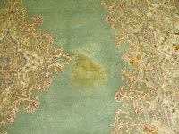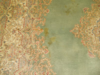 A customer brought in a hand knotted Persian Kerman rug with human blood all over it. His father had his nose bleeding and spelling the blood on the rug. They had treated this rug with chemical at home and when a rug is treated with chemical stuff to take care of the stains, this will make it more difficult to remove the stains.