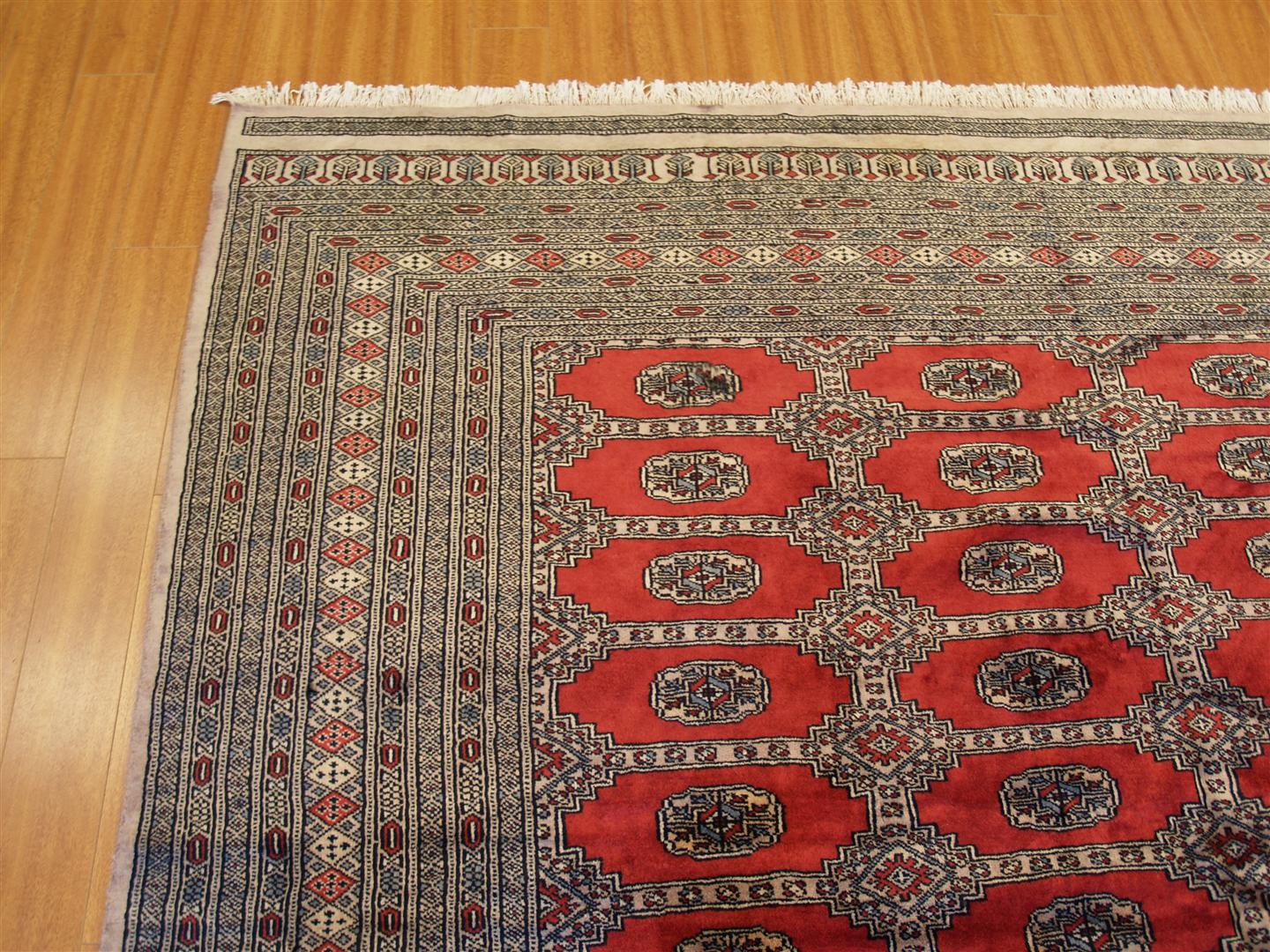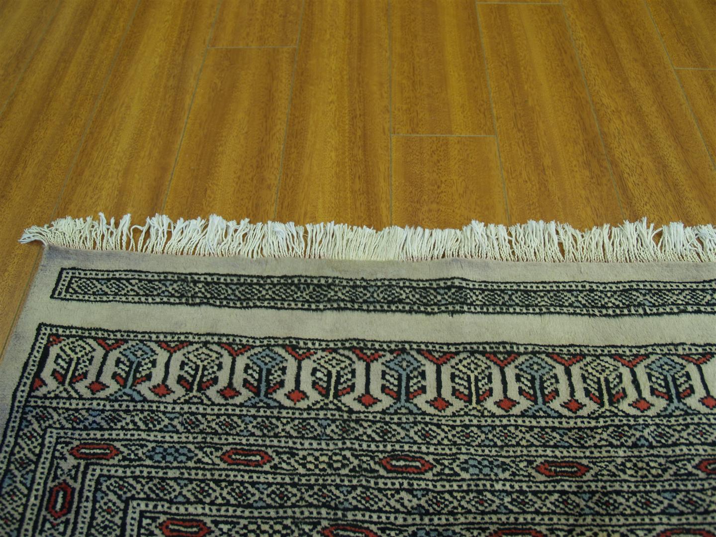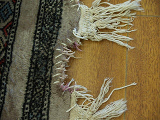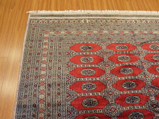A nice Bokhara rug was brought in by a customer for a deep cleaning; it definitely needed it as the rug had not been cleaned in about 3 years. While we were inspecting the rug a noticeable blemish jumped out at us… a chunk was torn off one of the ends of the rug. Take a look below: