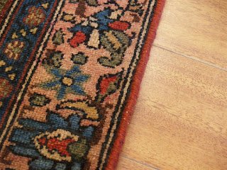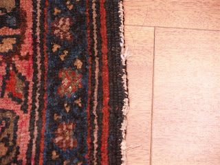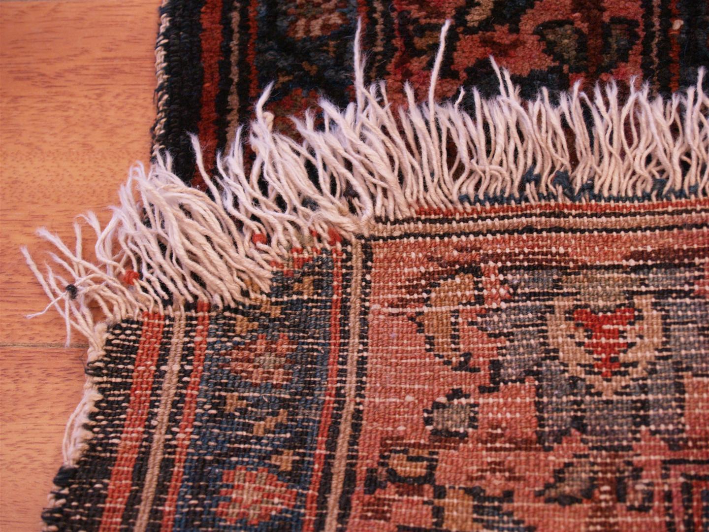 A new customer of ours brought in a beautiful rug that needed some attention. The rug was a Malayer Hamedan rug and was 100 years old. It needed a professional deep cleaning as well as repair work done. Both ends and sides were in different stages of unraveling and needed securing and rebinding to get it’s structure sound again. Take a look at some before pics below:
