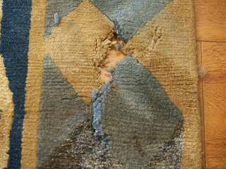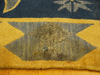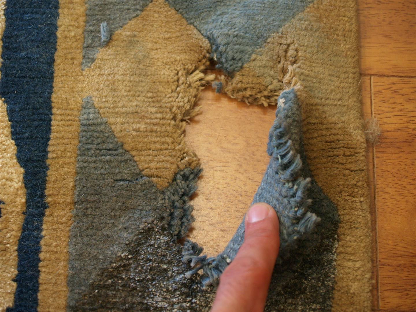 Today’s post involves a rug that has been shipped to us from Florida and was referred to us by one of our repeat customers. The rug is a beautiful handknotted piece that unfortunately had some water damage to part of it and developed dry rot. Dry rot on a rug is extremely fragile and breaks apart just by touching it. This rug meant a lot to the customer so he has opted for a custom repair job of downsizing the rug to remove the rotted parts. Take a look below: