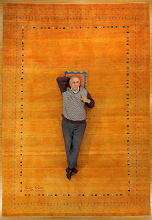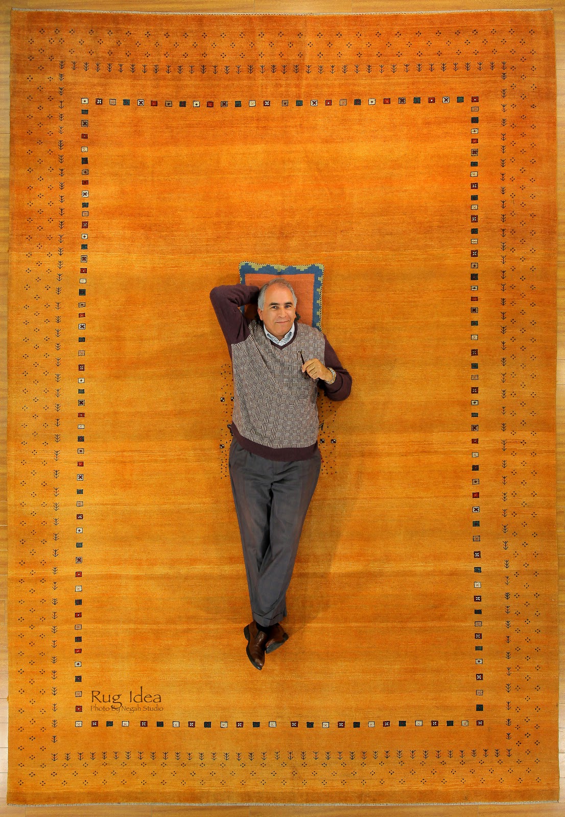The rug you see here is a 10′ x 14′ hand knotted wool on wool Gabbeh with harvest gold (my favorite) color. I am not included in the rug in case if you buy it! LOL