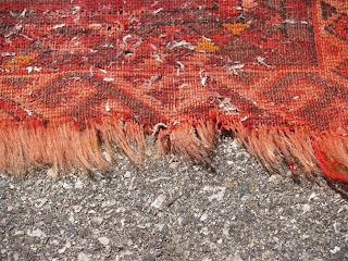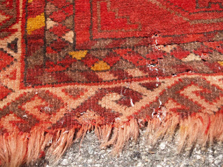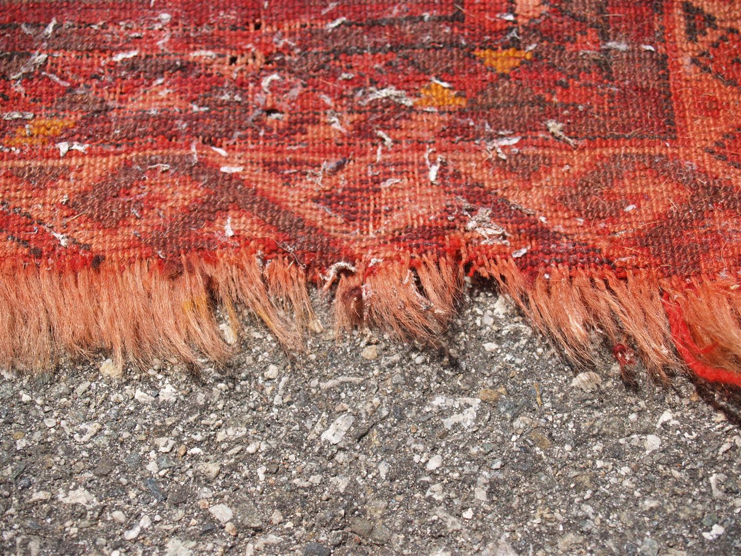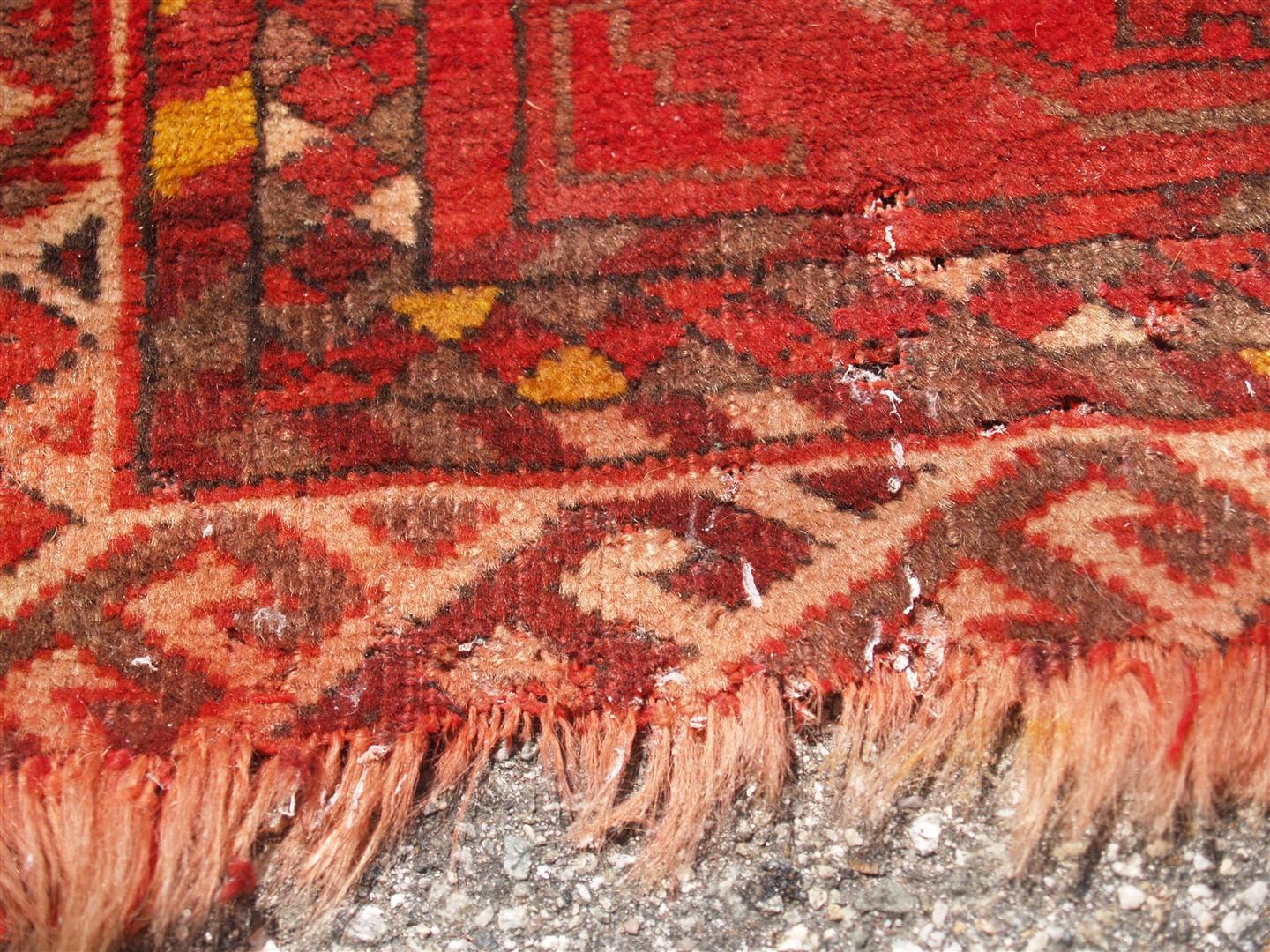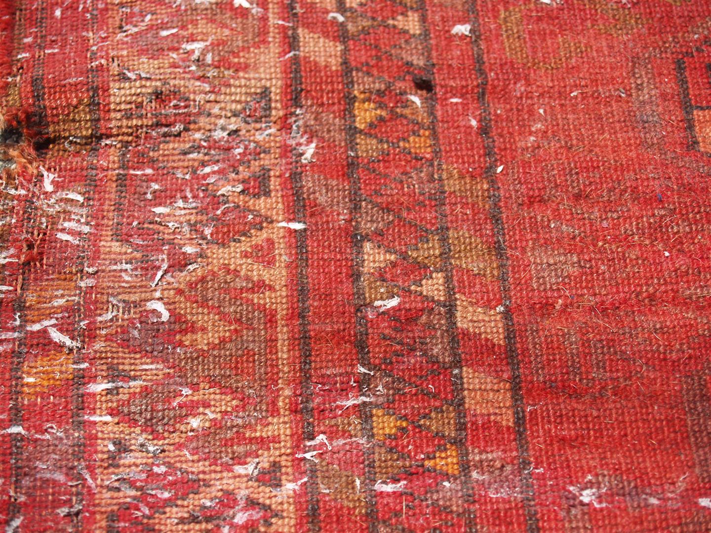 We went to a client’s house recently who had 11 rugs that had been stored in their garage but had not been inspected in about 5 years. To their surprise almost all of the stored rugs had some form of moth infestation. After being initially horrified by the infestation, they wanted to proceed with cleaning and restoration to help save what rugs we could. One was a beautiful red handknotted rug that had always been in their household but now looked in dire need of attention. Moth casing could be seen all over the rug and the ends were unraveling a lot, eating into the design of the rug. Take a look below: