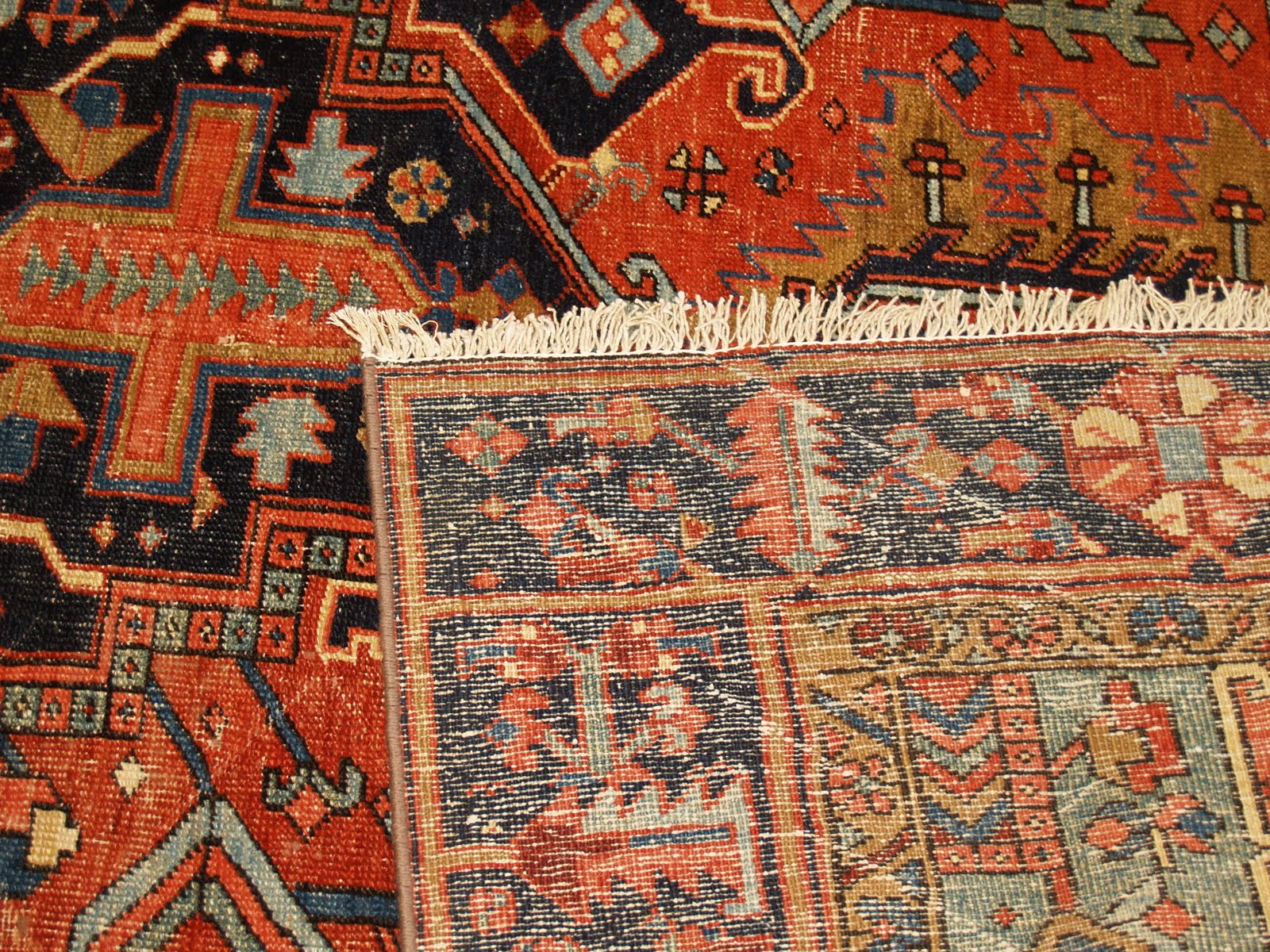Heriz rugs are commonly made with a cotton warp that can be either depressed or non-depressed. The weft can have two shoots or even a single weft. The weft is normally made with cotton and is a blue color. The pile is almost always wool and are generally more coarsely woven than traditional Persian carpets. The coarse pile can cause the floor covering to wear more quickly, but a very high quality Heriz will withstand wear for much longer than a lower quality one. There are some antique pre 1900 silk pile Heriz rugs with high count knots, but these pieces are very rare.