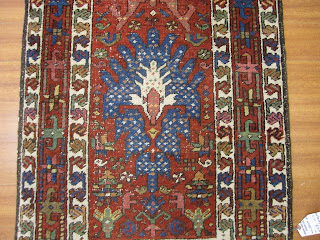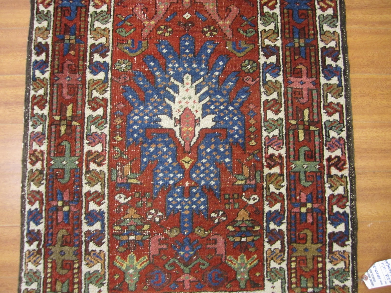 We also have few new Karadjeh runners in red and ivory background with birds and geometric designs. The newer versions of Karadjeh rugs have strong colors of turquoise, orange, and pink. These new pieces are priced $1,950. Sizes are 2′ 6″ x 10′.