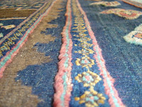 Here, you see photos of a kilim farsh, a combination of piled rug and flat weave made by three ladies in Varamin. The size is 6′ 9″ x 6′ 7″.
