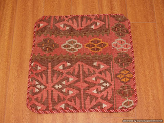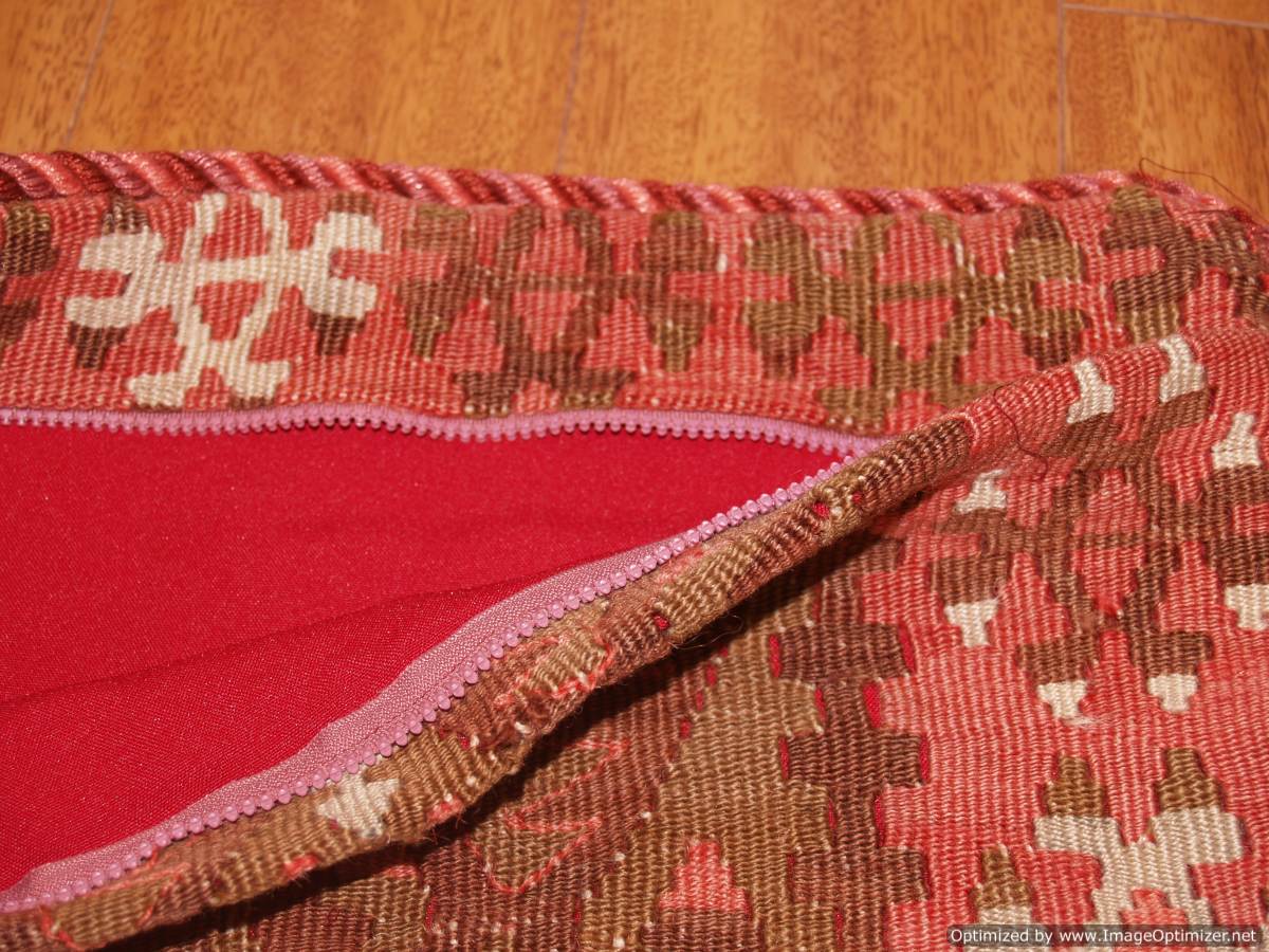 The kilim had totally fallen apart on all sides and was impossible to get back into a solid piece. We had a fabulous idea, though, that would keep the intact pieces together and could be displayed another way… a customized repair job. There were enough pieces that could be gathered to make a set of custom cushions fabricated from the remaining intact parts. Backing was installed on the kilim pieces and a custom sew job, complete with zipper for easy access, was done. Take a look at the results below!
