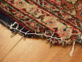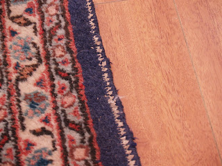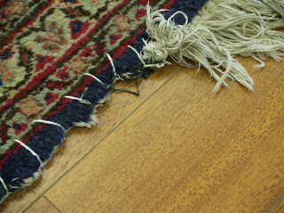 The pictures above show the dog damage as well as the wear that had happened to the selvages(the sides) due to vacuuming. The first step was to secure the damaged areas so that everything would be secure for the deep cleaning process. Take a look below: