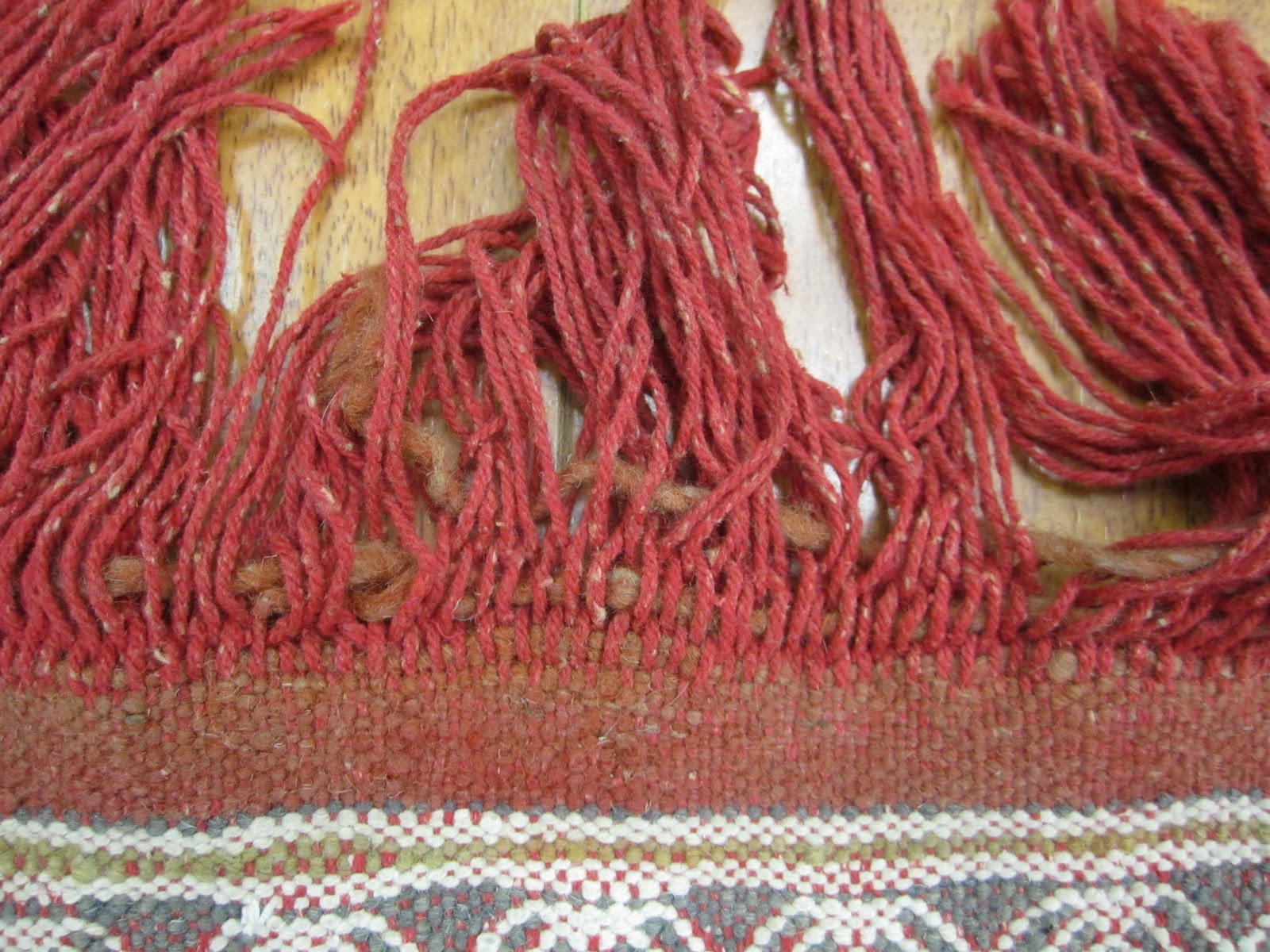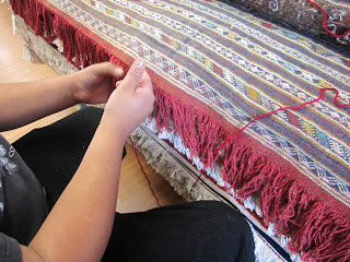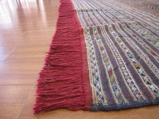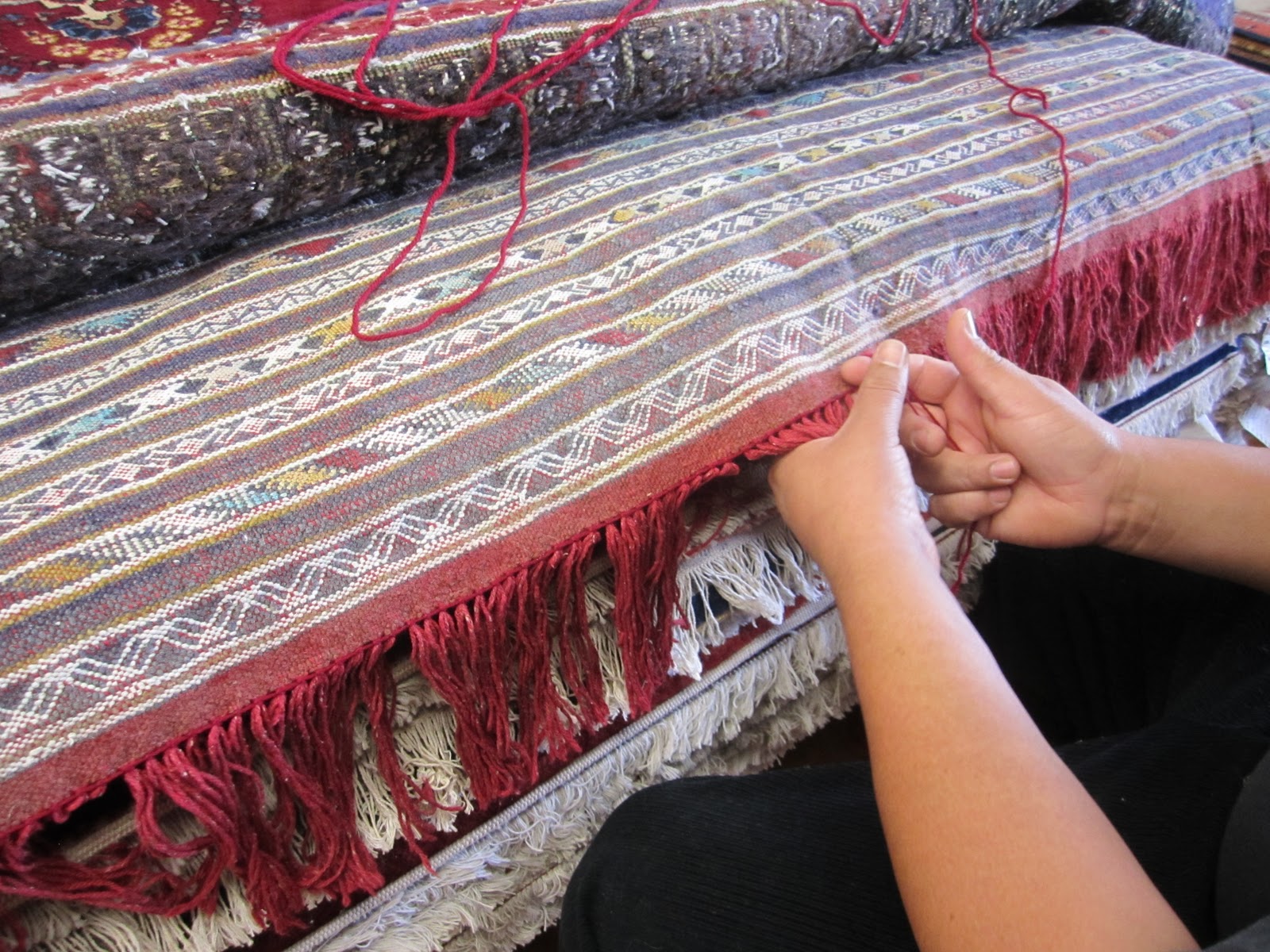 We sometimes receive Moroccan kilims and rugs for cleaning and repair. If these pieces are not washed by a professional, some colors may run and bleed. We had a customer few weeks ago who had washed her Moroccan kilim in her bathtub to save money. She messed the colors up and learned it the hard way. When she brought her kilim in, it was full of dye bleeding and bubbles. We corrected that for her. Many of these Moroccan flat weaves and kilims need repair and securing the fringes at least on one end. The wefts become lose after using the kilims on the floor and vacuuming them; therefore they need to be secured so the knots do not come off.