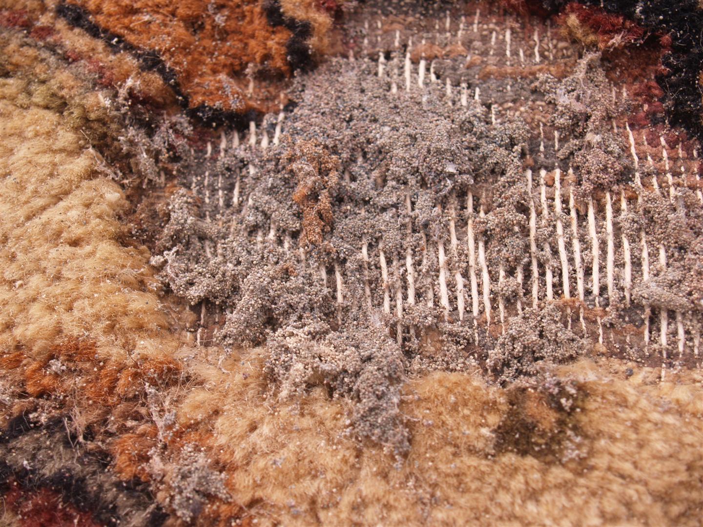 Moth damage to rugs is caused by the common clothing moth. It’s small and is usually silvery tan or soft brown in color. This moth flies slowly but with a rapid flutter of small wings. The females can lay hundreds of eggs each, and the eggs hatch into larvae that consume wool and silk fibers. Moths and their larvae thrive in dark, undisturbed areas where a rug gets little traffic and is not often vacuumed. A bad infestation sometimes leaves a cobweb-like veil in the area of the damage, along with fine, sand-like debris. An infestation often involves more than one rug, and can spread to (or from) woolens or furs hanging in a closet or sweaters stored in a drawer.