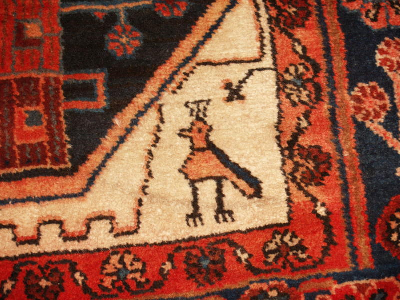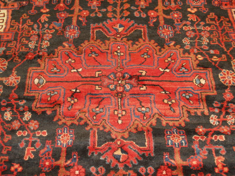 Iran with a population of 75 million has 30 provinces (states). Hamedan is a big and ancient state in north west Iran with eight counties such as Asasabad, Bahar, Hamedan (capital of the province), Kabudarahang, Malayer, Nahavand, Razan, and Tuyserkan. The province of Hamedan has a population of 2,000,000. There are roughly 500 villages in Hamedan province which produce beautiful hand knotted rugs, each with its own design, color palettes, and sizes. The city of Nahavand is located in south west Hamedan with a population of roughly 200,000 who speak Farsi (Persian) with Lori or Laki (a Kurdish dialect) accent. Nahavand has cold winters and ample supply of water which results in booming agriculture. Beautiful quality rugs are produced in Nahavand with cotton foundation and symmetrical knots. The wefts are cotton or wool. The background color is usually rust red or black and the pile is high and soft, made of local lamb’s wool. This is why Nahavand rugs are so durable. The design of Nahavand rugs is mostly geometrical with a big central medallion, leaves, abstract animals and trees. There may be vases and birds in the designs as well. In general, the designs are very simple and in no way elaborate and detailed. The sizes are small and usually less than 7’ by 10’. Some runners are also made. One of the most common sizes of Nahavand rugs is 5’ x 10’. Runners are occasionally made. It is not unusual to see dated or inscribed rugs made in Nahavand. I am posting a picture of a 7′ x 10′ Nahavand rug here with the name of the weaver. The inscription reads: “Weaver Fatima”. The looms are horizontal placed on the ground. Since Nahavand rugs are village, rural and tribal carpets, you see so many irregularities and imperfections in them and that is the beauty of the rugs from Nahavand. Each piece is exclusive and unique.