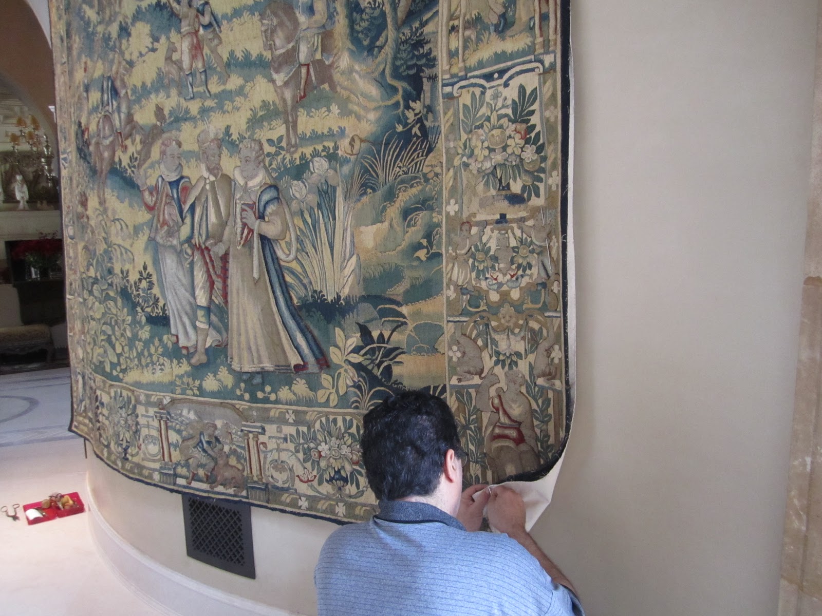 We cleaned and restored a 300-year old 18th century French tapestry for a customer. We installed a new backing to it by hand sewing for more and extra support. We installed the tapestry on the wall. They were happy but after a couple of weeks they called in and said there were some wrinkles and bubbles on the tapestry. Usually when you have a new backing on the tapestry and you hang it, this happens. I went to their house with one of our repair crew and did some alterations and the tapestry looked good and we left. We received another e-mail saying that the tapestry still had some wrinkles and bubbles on one side. I took one of our master repairmen yesterday and went to the client’s house. We had to remove one entire part of the backing while the tapestry was hanging on the wall and re-sew it by hand. It took us two hours to do this. We do whatever it takes to deliver first class jobs and services to make our customers happy. That is the core value of our company. Did I mention that our company was established by our father in 1953? We will celebrate our company’s 60th birthday on November 18, 2013.