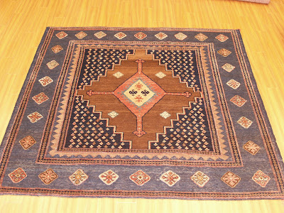 In one of our trips to Varamin, I saw a very old man who had an antique Kurdish Varamin Kilim Farsh, a combination of flat weave and pile rug. The size was almost 7’x 7′. Part of the rug in the center was made with un-dyed camel hair. I wanted to buy this beautiful piece but the man did not want to sell it to me. I said I would buy it from you with any fair price you give me but he rejected my offer. I said at least let me take a picture so we may reproduce a piece like this. The man agreed. We prepared the cartoon and made few pieces. Three female weavers worked on these kilim-farsh rugs. Two were rug weavers and one woman did the flat weave part. I have one of these rugs in my carpet store in Los Angeles. The central part and some motifs on the borders are pile rug and the rest is fine flat weave. The size is 6′ 6″ x 6′ 9″.