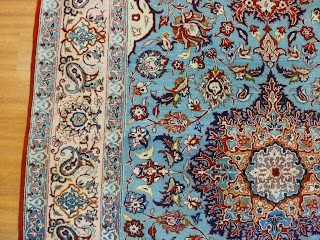 This beautiful rug was made 30 to 40 years ago in Central Iran in the large city of Isfahan which has a rug making tradition that dates back hundreds of years. The classic Corner/Central Medallion design is always in style and never out of market. This rug has a very high knot density and takes at least six months to make, making this rug a collectible and an excellent investment. It has recently been professionally deep cleaned and is ready for use in your home!