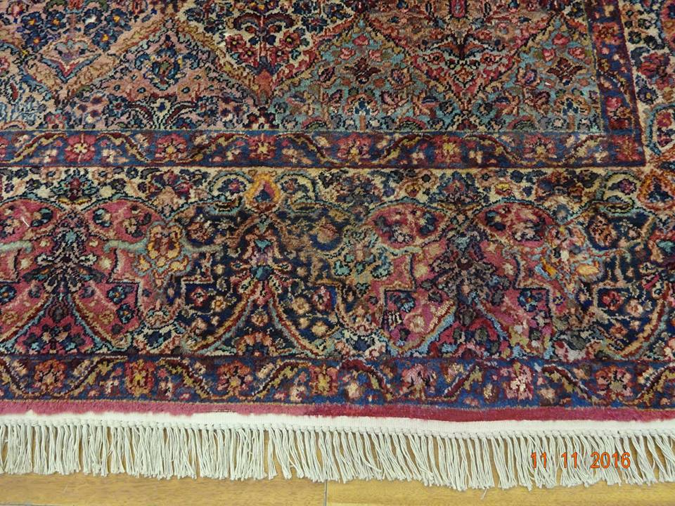 We picked up a big 10′ x 18′ Karastan rug from a client in Rancho Palos Verdes in south of Los Angeles. This rug was very dusty, and dirty with severe moth damages. The fringes were gone due to decades of foot traffic, and improper vacuuming.