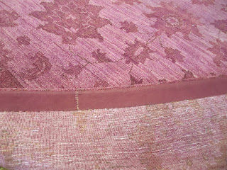 About a week ago a customer brought us a rug she had just bought. Unfortunately, they went to Las Vegas but did not take their dog with them. The dog, mad that he was left behind, decided to chew off the middle edge of the rug. The owner was extremely mad about the situation. She has a very unique rug which is composed of variety of pink and purple. The pile and foundation are wool.