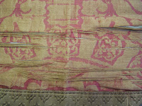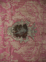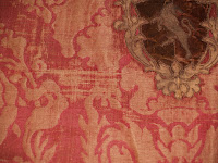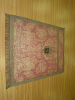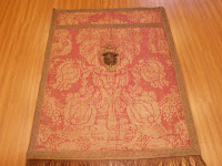 A customer brought in an antique fabric he had found in his grand mother’s closet after she passed away. This beautiful piece of fabric was made of silk with oxidized metal fringes. It looked at least 150 years old with an older coats of arm sewn and attached to it in the center. It looked European probably from Italy or Spain.