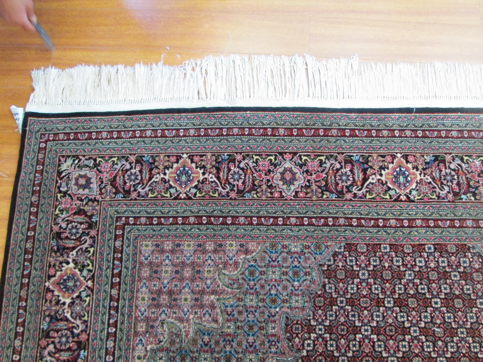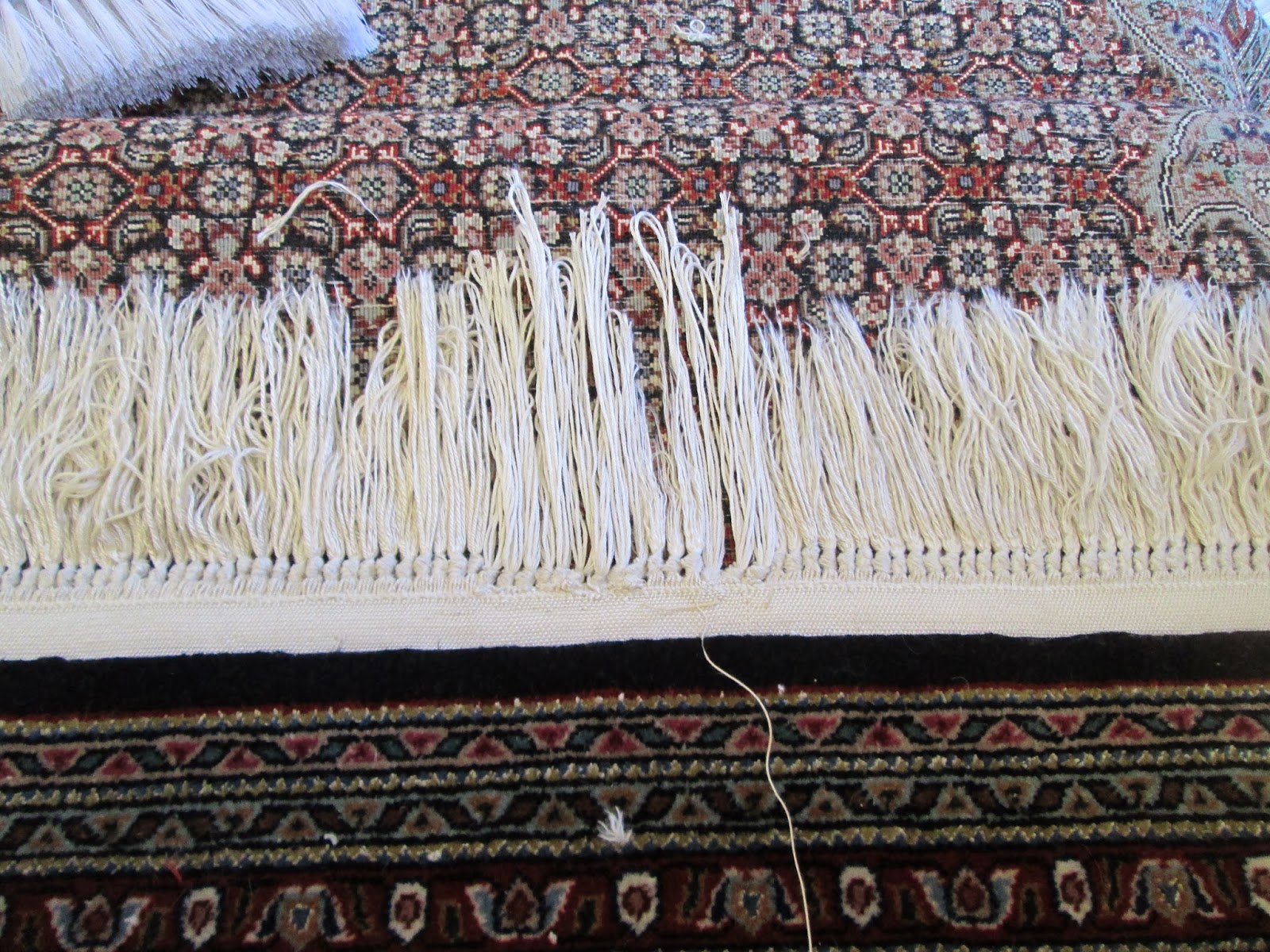 We received a very fine silk foundation hand knotted rug with damages on both ends and missing/rotten fringes. This rug was shipped to us from out of town by a colleague for repair and restoration of the fringes at both ends.