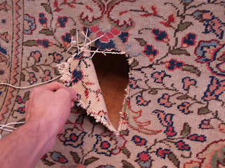The first step was securing all the loose parts so it could go to cleaning. After our deep cleaning process it was shinier, deodorized, sanitized and was ready for the repair. The hole was stitched back together by one of our master weavers. He then proceeded to put in brand new fringes to replace the worn out ones. The finished results produced a rug that looked brand new again! See the pics below: