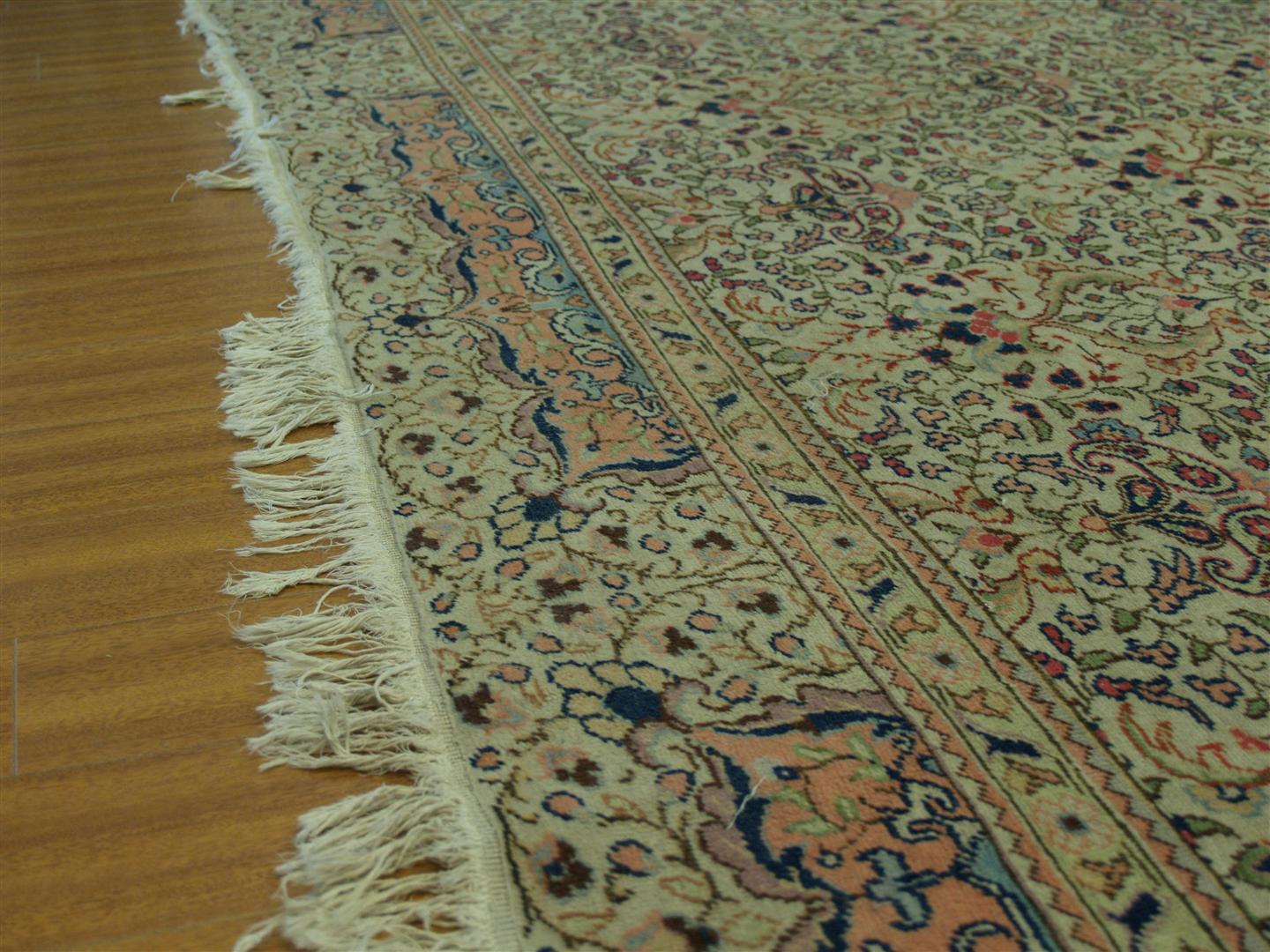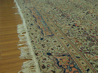 Today’s rug is a great example of how a cleaning/repair package can bring a rug back to life. Our customer brought in a very nice area rug that had seen some better times. It was very dirty, had a huge hole/tear in it and the fringes were in a sad state of disrepair. Take a look below: