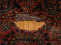 Two weeks ago, the same customer called and said she had finished the remodeling and wanted to use the carpets, but since the rugs were in a storage unwrapped by a moving company with whom she had worked in the past, she needed our opinion to see if the rugs needed cleaning. We went to her home to inspect the rugs. Unbelievable!! All the rugs smelled terrible. On the back of several of them, you could see mold and mildew. When we opened the antique lovely American Sarouk rug, it was heart breaking and shockening. There were many dry-rot places and a big hole as big as a dish in the middle of the rug in the upper side of this beautiful antique rug which had been in our customers family forever. The big old Hamedan rug was also no exception to this crime againts art and culture. The customer was running out of word and was speechless. She could not believe her eyes as she had not unrolled and had not opened the rugs. Unbelievable scene!!