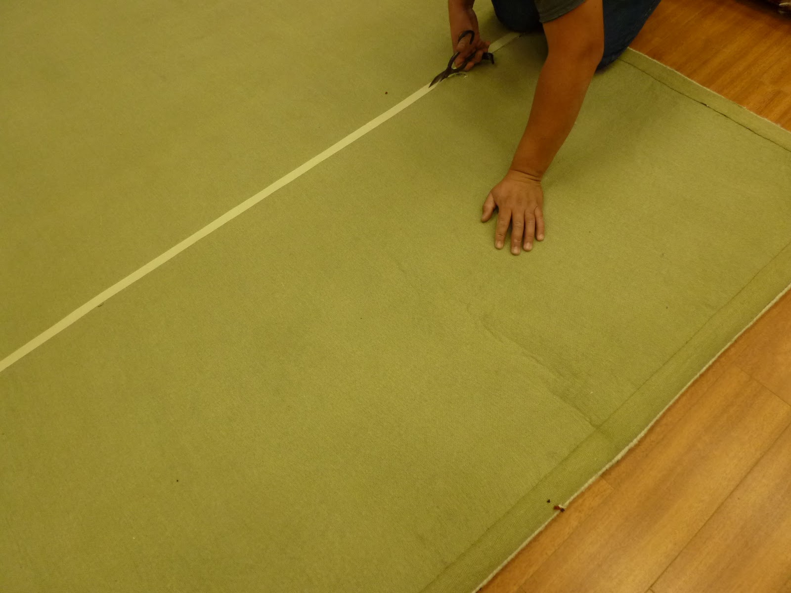 This 9′ x 13 piece should become an 8′ x 10′ rug. We will down size it and this will be done by hand in a day. We measure and tape it from the back first. It is much easier to do the measurement from the back with no pile. Then we cut the rug.