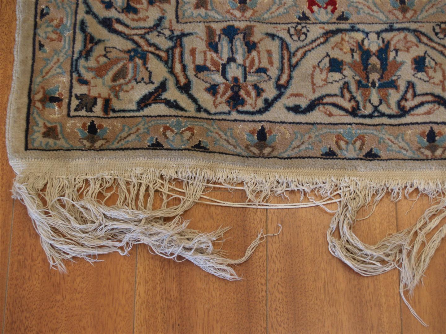 Taking a look at the picture above, both ends have been secured and the “cavities” that had developed on the rug have been taken care of. The difference is immediately noticeable on this Persian Nain Rug; and more than that the rug is in great shape, ready to be used and enjoyed again. If your rug is showing signs of cavities from the unraveling of the fringes, come see us so we can get the process started to putting the beautiful back into it.