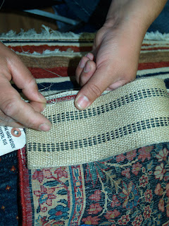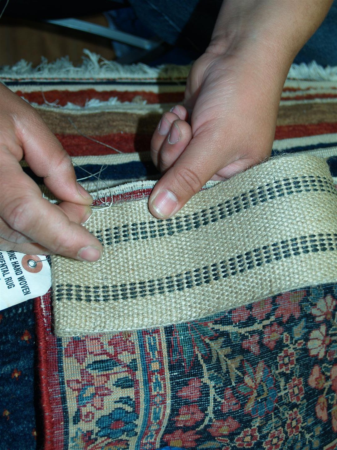 Our customer expressed interest in hanging the rug once it was deep cleaned, and we had the perfect answer. At Rug Ideas we do canvas installation on rugs and tapestries so that they can be used for hanging/displaying on the wall. One of our weavers sewed on the canvas to the back/top of the rug by hand; the installation allows a rod to be placed through the center gap of the canvas and makes for easy hanging.