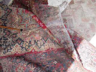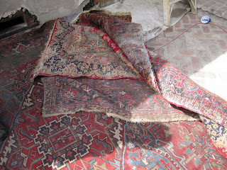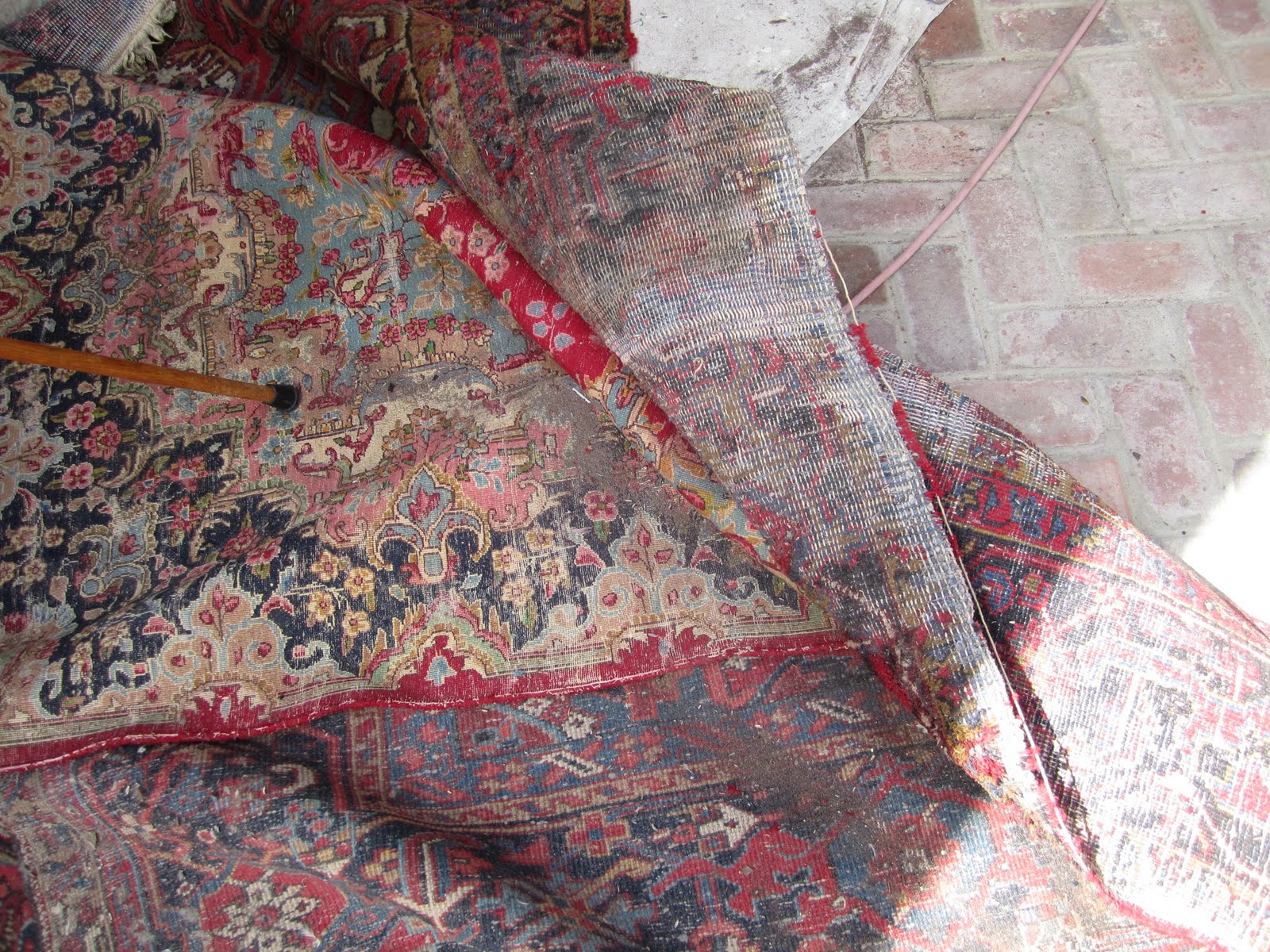 A couple of days ago, we picked up two very old Persian Herize rugs and one Persian Kerman rug from a very old client’s home. This client, a 92-year old gentleman, had left these rugs in storage for ten years without first cleaning them and then wrapping them properly. The rugs were rolled in the yard when we went to pick them up. He was a referral from another rug dealer.