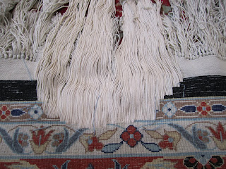 To do the job, first we had to make foundation by warping, and securing the vertical threads. We had to use the same quality of silk with the same thickness to reach the same knot density and construction. We could not find all the colors of silk yarns we needed, therefore we had to dye some. After we finished weaving the damaged areas of the end in two places, we had to reweave the flat weave part which was very delicate. Rug repair is an art by itself.