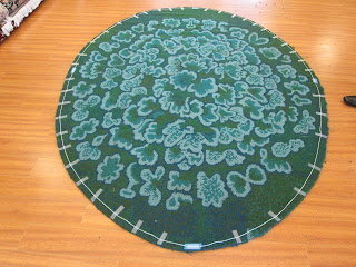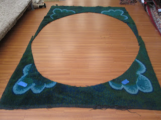 A client brought in this rug and wanted us to make an oval rug out of it. We measured and marked the rug and cut it. One of our master weavers then secured the edges and did the bindings by hand. Out of the scraps, we also made two square rugs that she can use by her bed.
