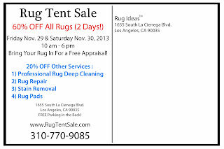 We will also have 20% off on our services which include professional rug cleaning, repair, stain removal, and appraisal. This tent sale will be held for two days only and will not be extended.