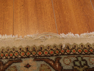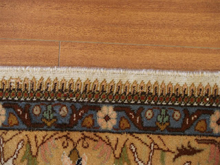 Wear often begins on the heavily trafficked borders,but the fringes,or ends of the warps which run up and down the length of the carpet,are usually the first part of the fabric to wear out.Edges or selvedges along the sides of the rug frequently weaken and unravel a little later.One should closely inspect these areas from time to time to see if repair or overcasting is required. This stitching may be done by us at our showroom after the rug is professionally cleaned.