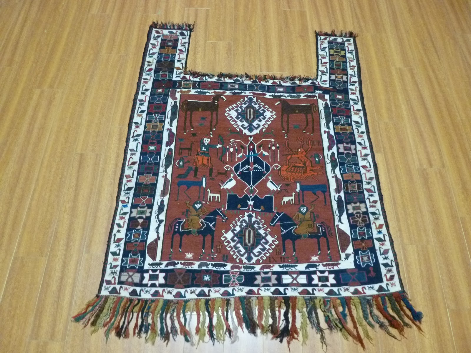 Here, I am posting a picture of a horse trapping which is very finely woven. These trappings are ornamental and in some instances ceremonial textiles and accessories. This one is roughly 3′ x 4′ from my personal collection. Just take a look at the strange designs and motives.