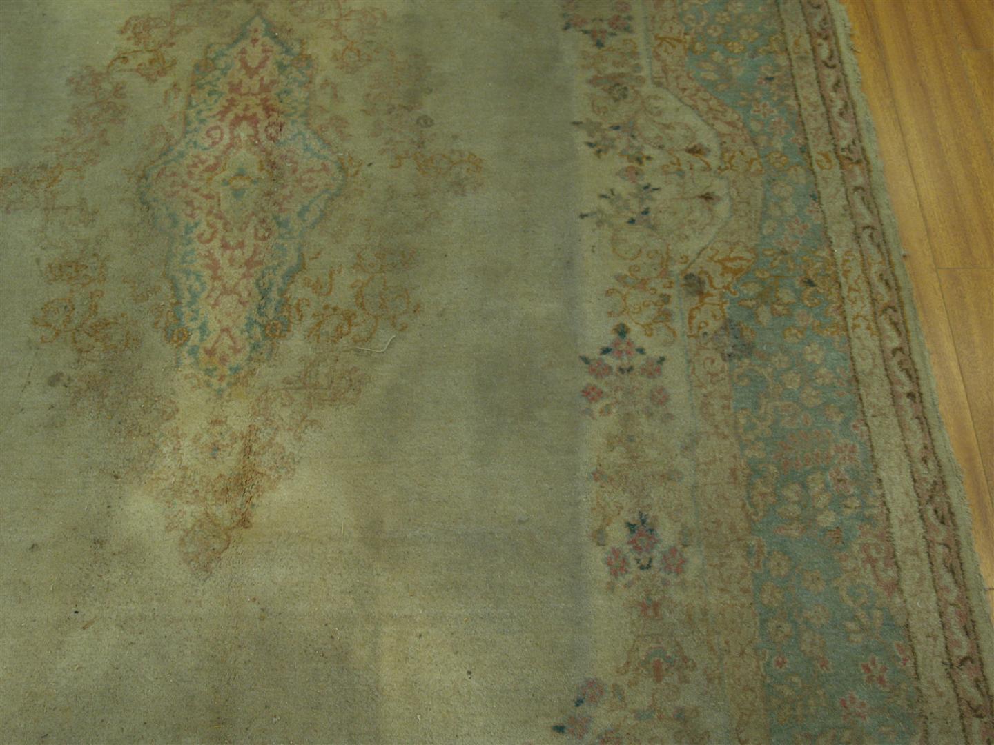 A customer decided to do some summer cleaning at his house and decided that this was the time to have a Kerman rug in his living room deep cleaned. It is a beautiful rug but came in with a layer of dirt and had multiple stains which made it a little bit of an eyesore. Take a look below: