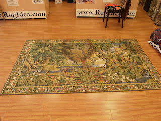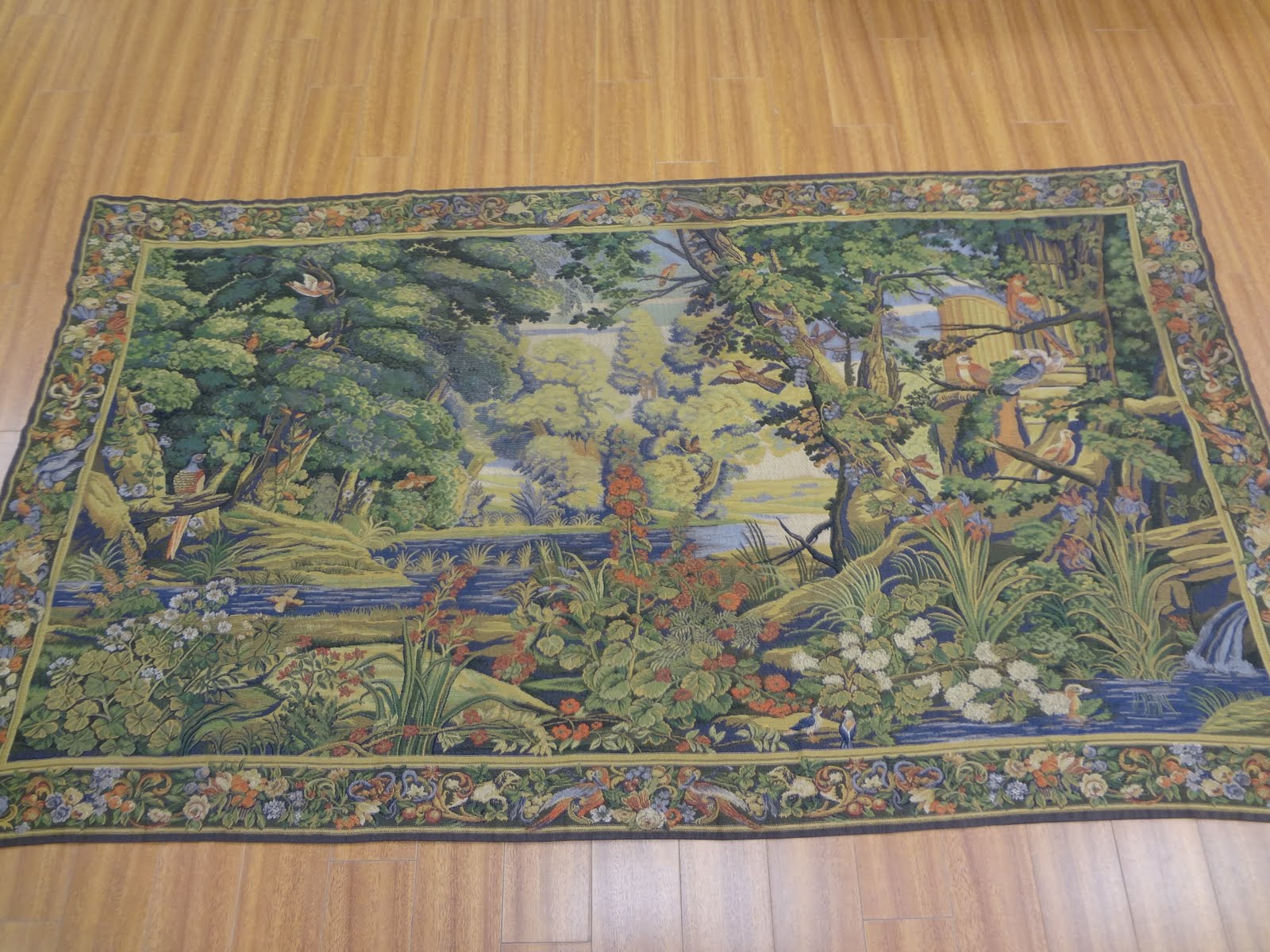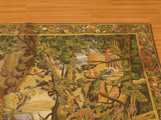 Rug and tapestry cleaning, repair and stain removal is another service that we provide for our clients. We received this tapestry from a client from Alabama. It was water damaged by a severe leak from the roof over the wall it was hung on . We cleaned it first and then did stain removal in several steps and phases. It worked out great. Tapestry stain removal is much harder than rug stain removal. Rugs have pile and we can apply different type of stain removal stuff to the pile. Tapestries have no pile and they are very delicate and this makes the stain removal more difficult than carpet of even kilim stain removal.