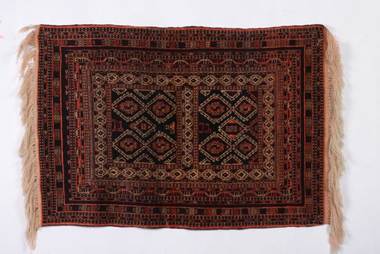 Turkestan is noteable for its production of the ancient “Bokhara” patterns. The name “Bokhara” for modern Pakistani rugs derives from the name of the railway station where these rugs were collected and shipped to the West. These rugs are traditionally a deep shade of red with a repeating pattern of guls (polygons) in dark blue, black or brown with white accents.