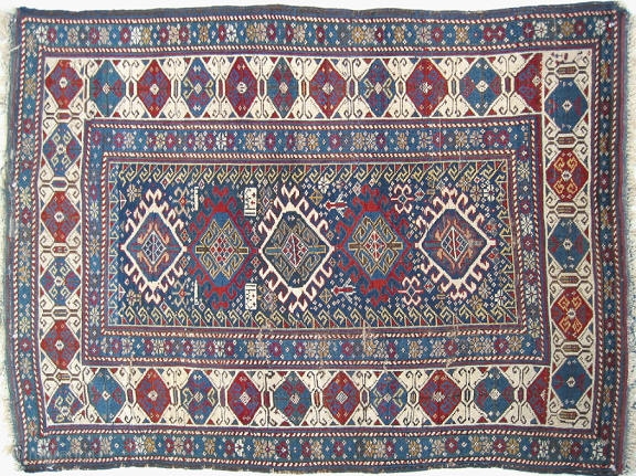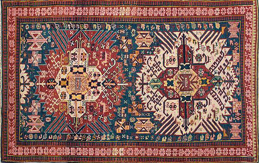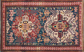 Caucasian rugs are lively, abstract and noticeable. Shirvan come in three basic designs: large medallions (with the open spaces filled with small motifs), overall patterns of tiny, geometrical floral motifs and prayer rugs with blue and ivory ground. Baku carpets have large motifs and muted colors, such as ivory, blue and light blue. They are woven in small, neat, individual geometric motifs, and in the floral and boteh forms. Striped medallions, which originally come from Iran, are more in evidence than in rugs that are woven in other areas. Hila (Chila) carpets have a medallion layout with corner motifs, and the field is closely covered with botehs. Kuba carpets are very similar to Bakus, but the pile is longer and the colors much brighter. In the mountanous are of Daghestan, coarse carpets with a high pile are woven.