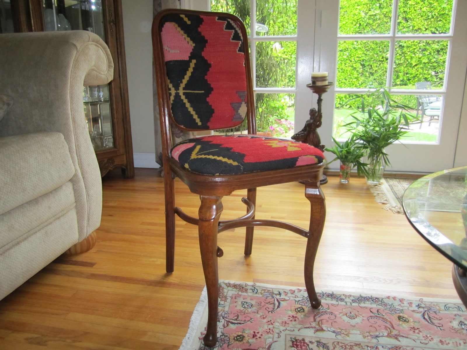 We recently acquired one of his authentic chairs from an Austrian family. This chair was made in Michael Thonet’s workshop in Austria probably around 1850. We did the upholstery with a handmade kilim. It is a beauty. We sell this signed (there are two signatures) antique original chair for $1,000.
