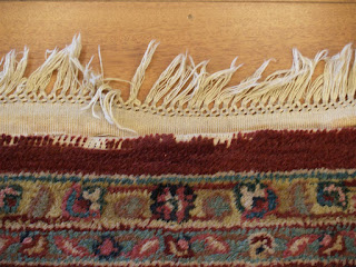 We proceeded to do the cleaning of all her rugs, which got the full Rug Ideas treatment, and when we were done we started on repair the ends of the rug. The owner opted to have the fringes removed and then have us hand sew binding on the ends to make the rug look uniform. We had our weaver start the process and in no time we had a great looking rug in front of us. Take a look below: