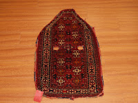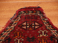 In a recent acquisition we received a beautiful Turkomen horse saddle cover rug. It is dated 1968 and there are two holes in it for the handles of the saddle to pass through. There are some Russian scripts woven onto this pieces that might be the name of the horse this cover was made for. We should find someone who can read Russian to see what these words are. I am posting the photos of this unique piece.