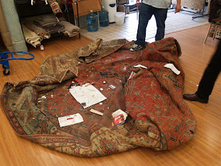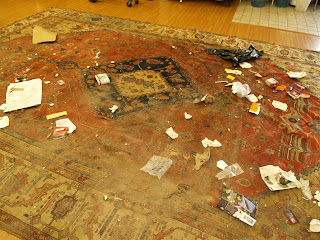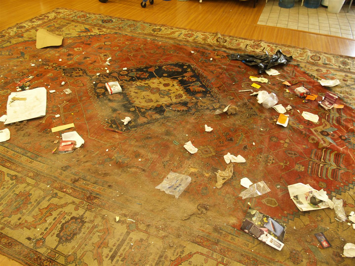In our quest to clean, repair & restore Persian, Oriental & area rugs we have come across an interesting job. A customer called a couple weeks ago and mentioned that he had 2 rugs that had been in his ownership for the last 30 years and had been previously handed down to him by his father. The rugs in question, however, were buried in an apartment that had almost no room to move due to boxes upon boxes of collectibles and paper that had overtaken the apt.